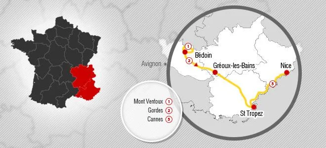 Длинный холмистый маршрут с видом на горные хребты Альп и с постоянно меняющимися пейзажами проведет вас через маленькие деревни Прованса, где черпал вдохновение для своих книг Питер Мэйл, к Лазурному берегу.
